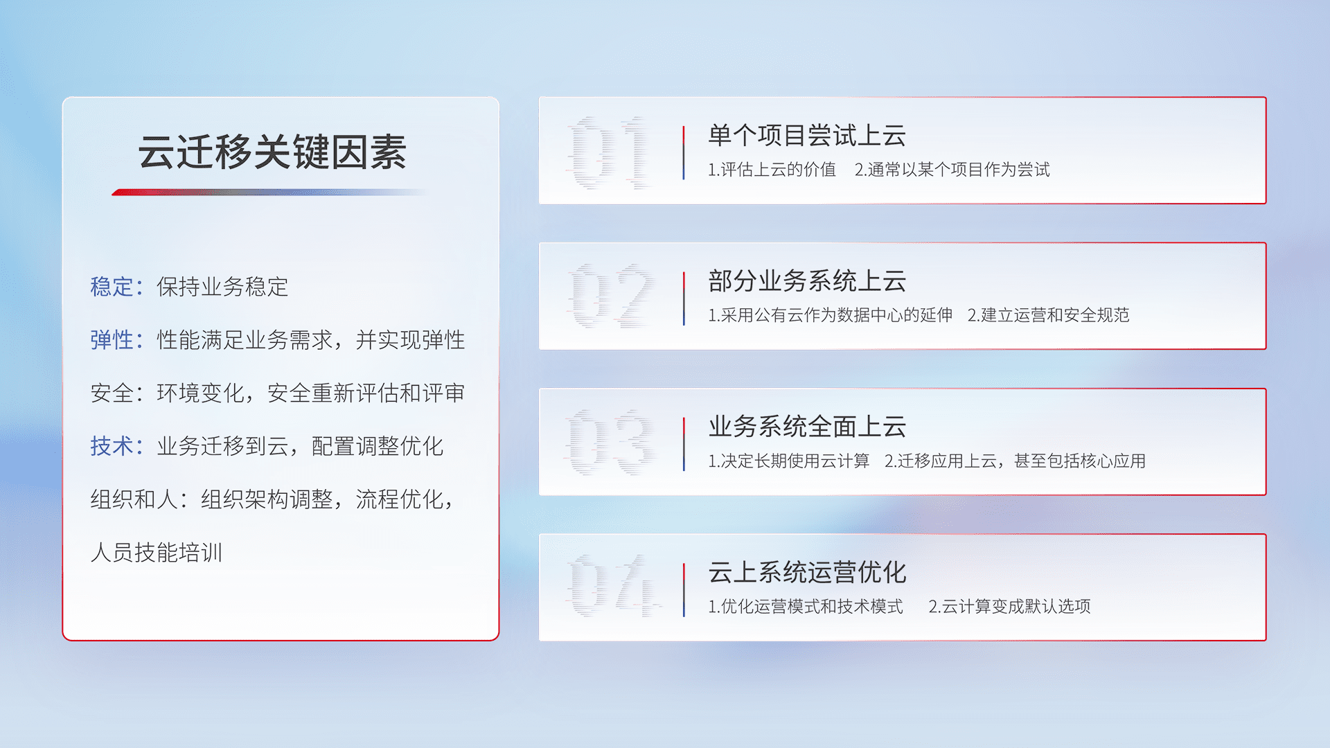 结合实际业务,,,从规划设计、、云平台选型、、、、云原生改造、、、数据迁移、、、集成交付,,迁移全过程为客户识别最佳上云路径,,,,做好风险识别管理,,,设计网络架构、、身份权限、、安全审计合规、、操作审计、、、、日志审计、、、、监控告警策略、、、、多站点容灾设计等,,,,对云上基础设施进行整体规划,,,,提升IT治理水平,,,,以满足弹性、、、、高可用、、高性能的需求。。