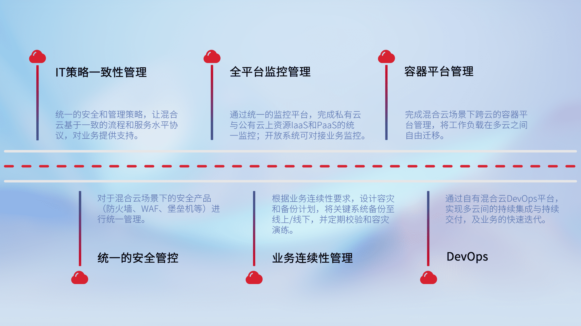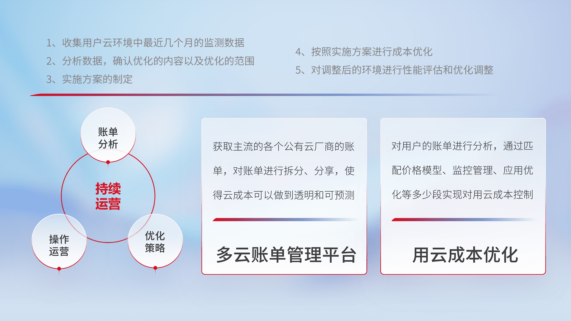 通过多云纳管,,以统一的资源数据模型把客户的云资源进行抽象和封装,,进而实现对多云资源的统一操作,,,,保障云资源管理的可靠性、、、稳定性与可用性。。。。量身定制化运维内容,,,,配置、、、开发运维、、补丁管理、、、、备份、、监控、、认证和访问管理、、、、审计和日常巡检等,,保障在用云过程中的可靠度,,,稳定度以及高可用率。。。。