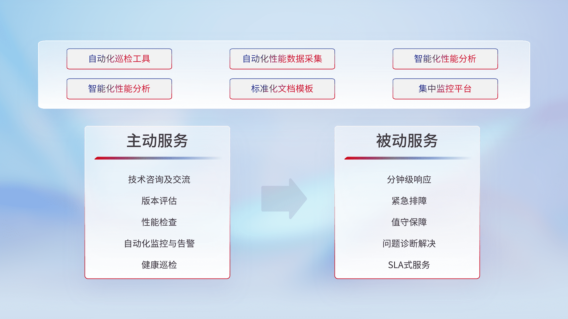智能化工具和标准化文档,,,保障服务质量,,,,提供主动服务(包含技术咨询、、版本评估、、、性能检查、、、自动化监控与告警、、、、健康巡检)和被动服务包含(分钟级响应、、紧急排障、、、、值守保障、、、问题诊断解决、、、SLA服务)。。。